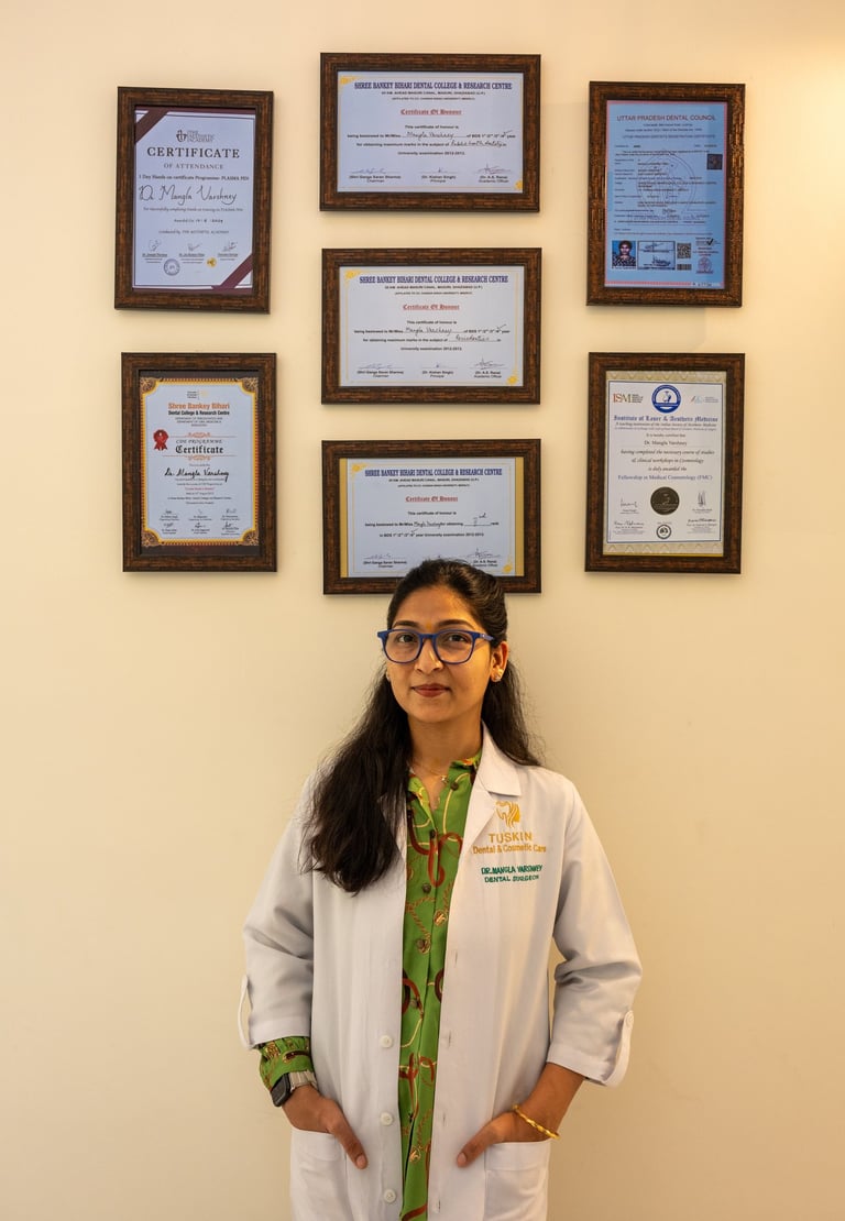 Dr. Mangla Varshney is a highly experienced Dental Surgeon with over 12 years of clinical expertise in providing quality dental care. She is known for her patient-centric approach, precise diagnosis, and commitment to delivering safe, comfortable, and effective dental treatments. Dr. Varshney focuses on maintaining high standards of hygiene and personalized care to ensure long-lasting oral health and confident smiles.